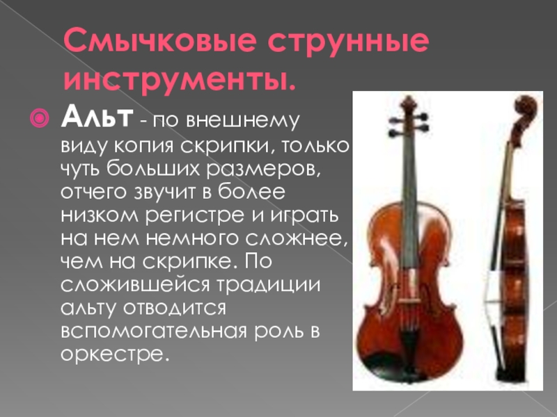больших размеров, отчего звучит в более низком регистре и играть на нем немного сложнее, чем на скрипке. По сложившейся традиции альту отводится вспомогательная роль в оркестре.