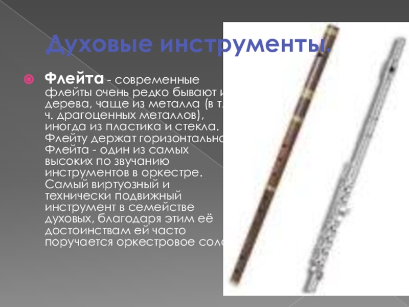 из металла (в т.ч. драгоценных металлов), иногда из пластика и стекла. Флейту держат горизонтально. Флейта - один из самых высоких по звучанию инструментов в оркестре. Самый виртуозный и технически подвижный инструмент в семействе духовых, благодаря этим её достоинствам ей часто поручается оркестровое соло.