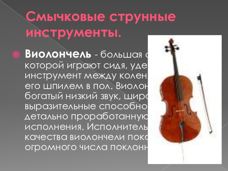 инструмент между коленями и упирая его шпилем в пол. Виолончель имеет богатый низкий звук, широкие выразительные способности и детально проработанную технику исполнения. Исполнительские качества виолончели покорили сердца огромного числа поклонников.
