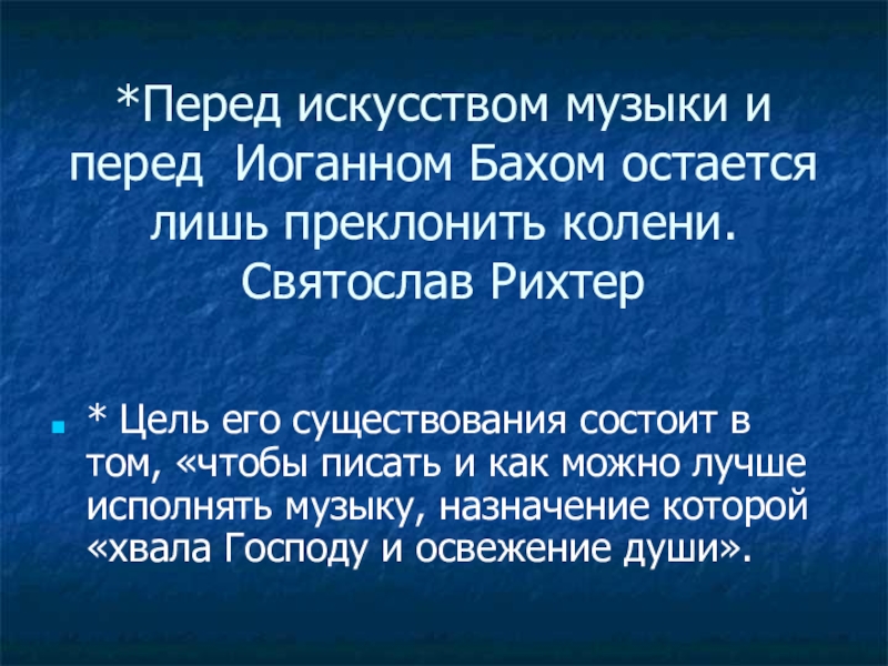 * Цель его существования состоит в том, «чтобы писать и как можно лучше исполнять музыку, назначение которой «хвала Господу и освежение души».