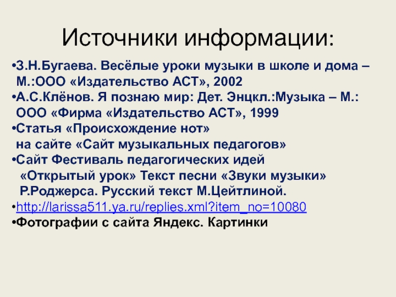Источники информации:З.Н.Бугаева. Весёлые уроки музыки в школе и дома – М.:ООО «Издательство АСТ», 2002А.С.Клёнов. Я познаю мир: