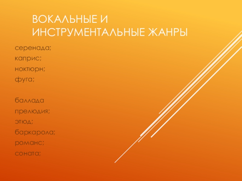 Вокальные и инструментальные жанрысеренада;каприс;ноктюрн;фуга;балладапрелюдия;этюд;баркарола;романс;соната;