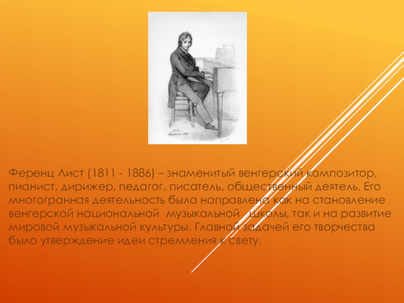 Ференц Лист (1811 - 1886) – знаменитый венгерский композитор, пианист, дирижер, педагог, писатель, общественный деятель. Его многогранная