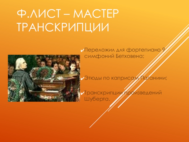 Ф.Лист – мастер транскрипцииПереложил для фортепиано 9 симфоний Бетховена;Этюды по каприсам Паганини;Транскрипции произведений Шуберта.