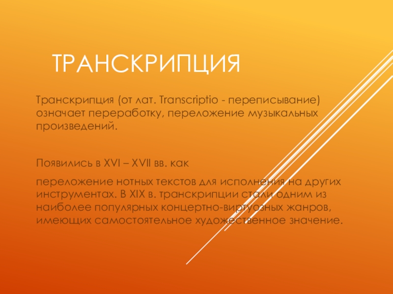 ТранскрипцияТранскрипция (от лат. Transcriptio - переписывание) означает переработку, переложение музыкальных произведений. Появились в XVI – XVII вв.
