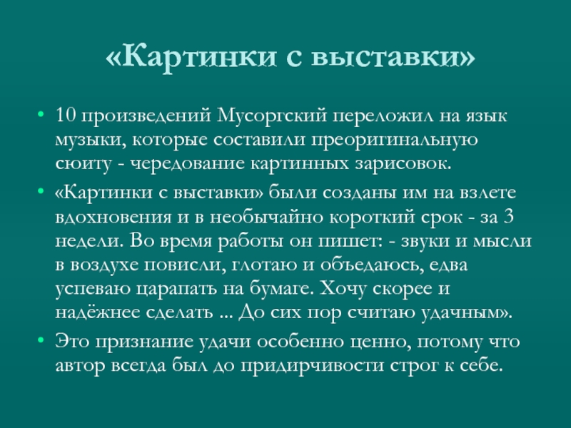 «Картинки с выставки»10 произведений Мусоргский переложил на язык музыки, которые составили преоригинальную сюиту - чередование картинных зарисовок.«Картинки