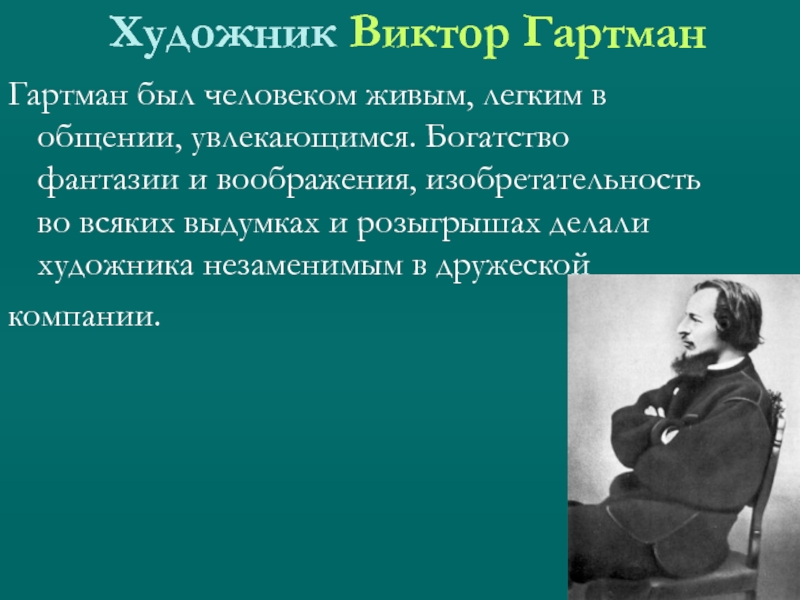 Художник Виктор ГартманГартман был человеком живым, легким в общении, увлекающимся. Богатство фантазии и воображения, изобретательность во всяких