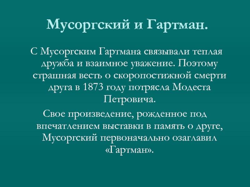 Свое произведение, рожденное под впечатлением выставки в память о друге, Мусоргский первоначально озаглавил «Гартман».