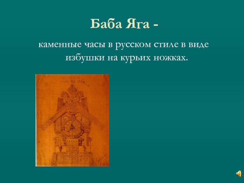 Баба Яга - каменные часы в русском стиле в виде избушки на курьих ножках.