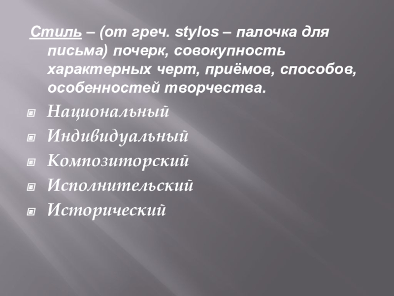 Стиль – (от греч. stylos – палочка для письма) почерк, совокупность характерных черт, приёмов, способов, особенностей творчества.НациональныйИндивидуальныйКомпозиторскийИсполнительский