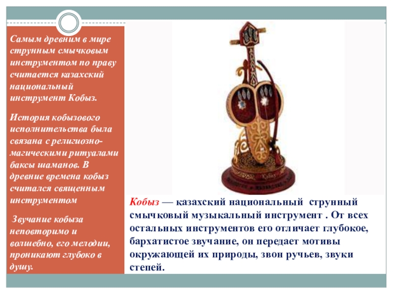 Самым древним в мире струнным смычковым инструментом по праву считается казахский национальный инструмент Кобыз.
