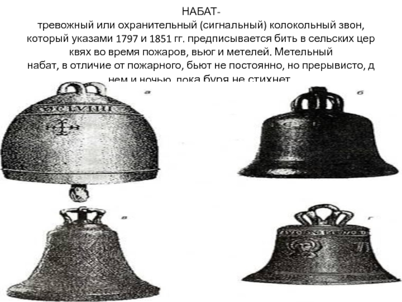 Слайд 10НАБАТ- тревожный или охранительный (сигнальный) колокольный звон, который указами 1797 и 1851 гг. предписывается бить в сельских церквях во время пожаров, вьюг и метелей. Метельный набат, в отличие от пожарного, бьют не постоянно, но прерывисто, днем и ночью, пока буря не стихнет.