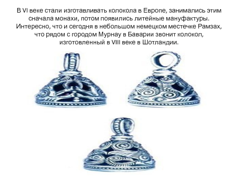 Слайд 7В VI веке стали изготавливать колокола в Европе, занимались этим сначала