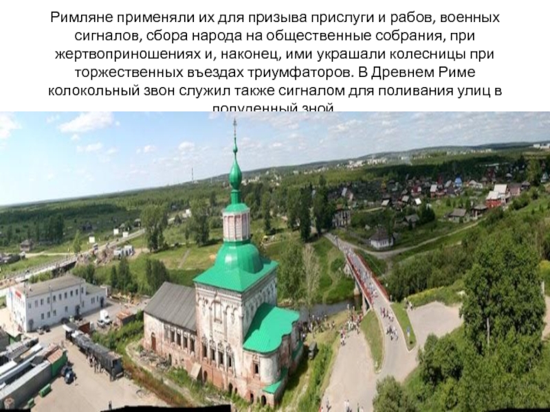 народа на общественные собрания, при жертвоприношениях и, наконец, ими украшали колесницы при торжественных въездах триумфаторов. В Древнем Риме колокольный звон служил также сигналом для поливания улиц в полуденный зной.