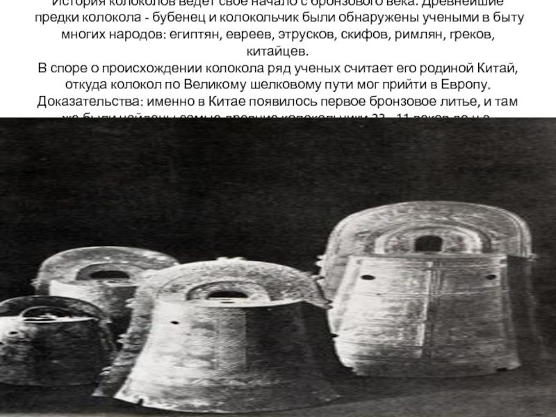 Слайд 3История колоколов ведет свое начало с бронзового века. Древнейшие предки колокола
