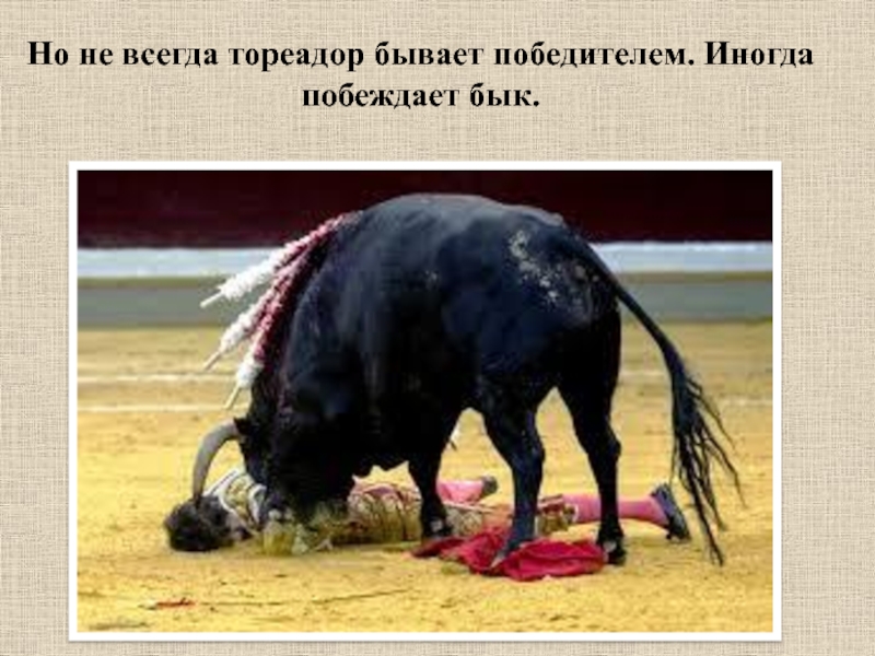Слайд 20Но не всегда тореадор бывает победителем. Иногда побеждает бык.