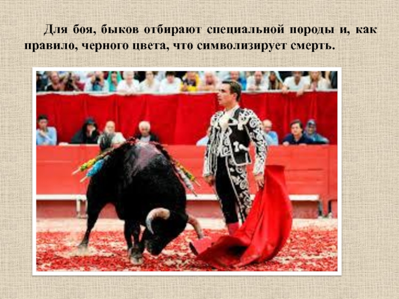 Слайд 16Для боя, быков отбирают специальной породы и, как правило, черного цвета,