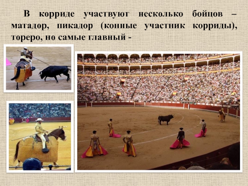 Слайд 18В корриде участвуют несколько бойцов – матадор, пикадор (конные участник корриды),