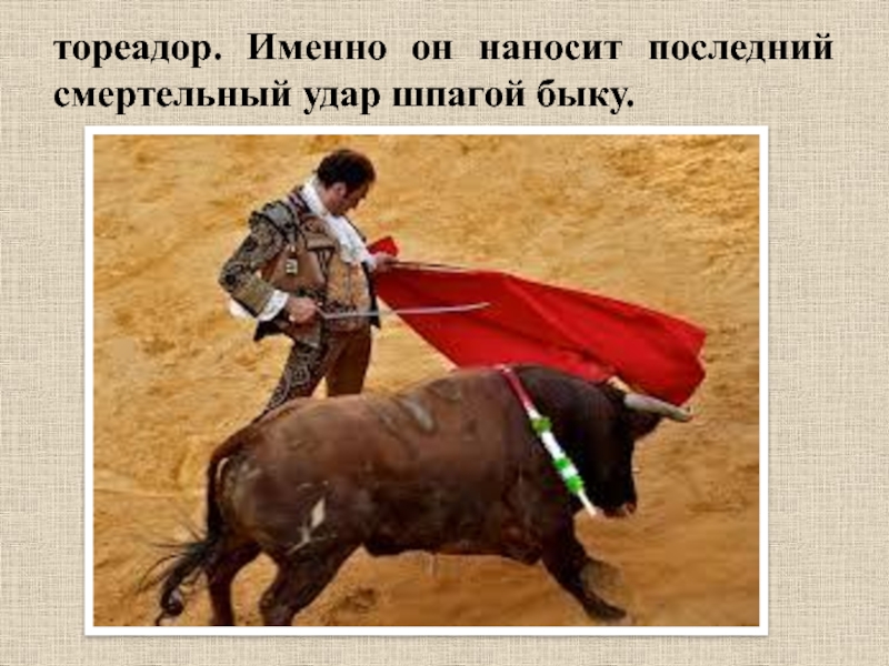 Слайд 19тореадор. Именно он наносит последний смертельный удар шпагой быку.