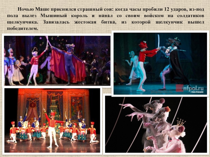 пола вылез Мышиный король и напал со своим войском на солдатиков щелкунчика. Завязалась жестокая битва, из которой щелкунчик вышел победителем.
