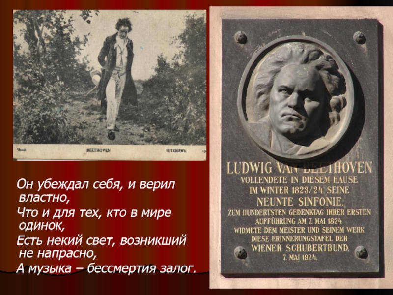 И Бетховен остаётся верен своему жизненному девизу: «От тьмы – к свету, через борьбу - к победе!» Музыка Бетховена учит нас преодолевать любые жизненные препятствия.