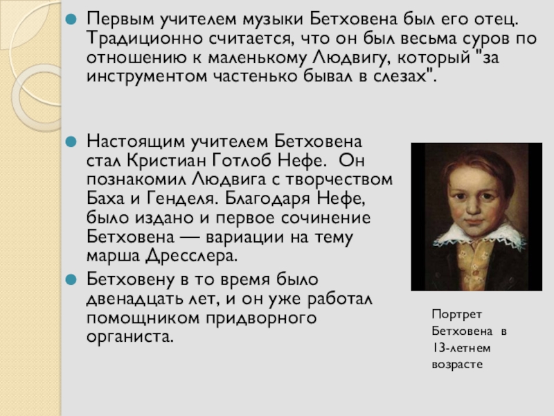 Настоящим учителем Бетховена стал Кристиан Готлоб Нефе. Он познакомил Людвига с творчеством Баха и Генделя. Благодаря Нефе, было издано и первое сочинение Бетховена — вариации на тему марша Дресслера.