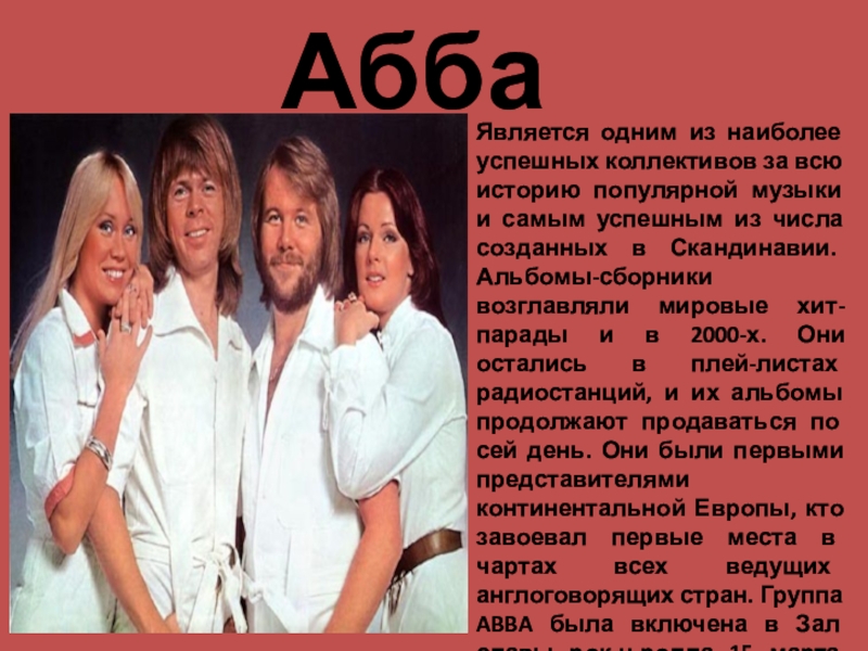 и самым успешным из числа созданных в Скандинавии. Альбомы-сборники возглавляли мировые хит-парады и в 2000-х. Они остались в плей-листах радиостанций, и их альбомы продолжают продаваться по сей день. Они были первыми представителями континентальной Европы, кто завоевал первые места в чартах всех ведущих англоговорящих стран. Группа ABBA была включена в Зал славы рок-н-ролла 15 марта 2010 года.
