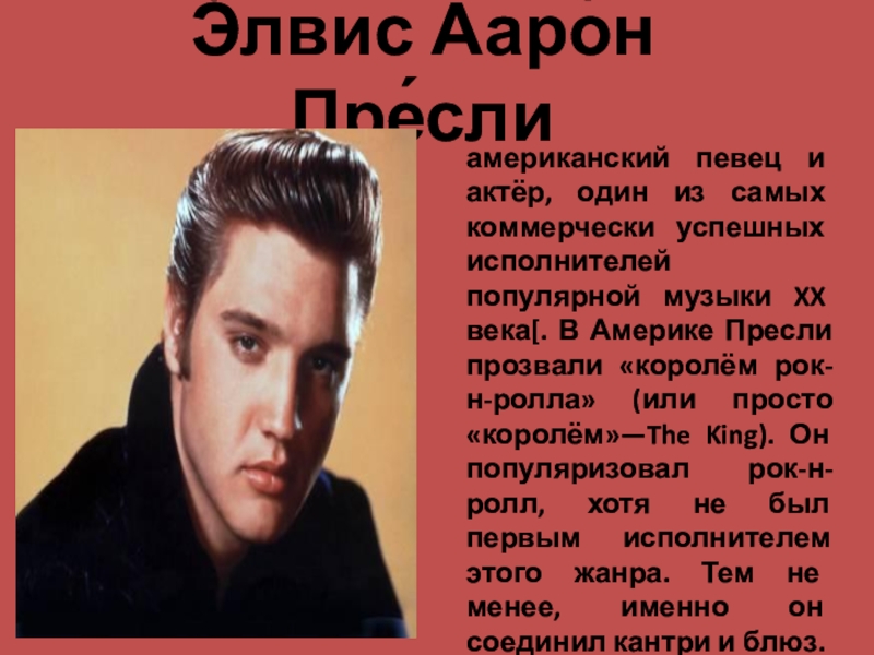 исполнителей популярной музыки XX века[. В Америке Пресли прозвали «королём рок-н-ролла» (или просто «королём»—The King). Он популяризовал рок-н-ролл, хотя не был первым исполнителем этого жанра. Тем не менее, именно он соединил кантри и блюз.