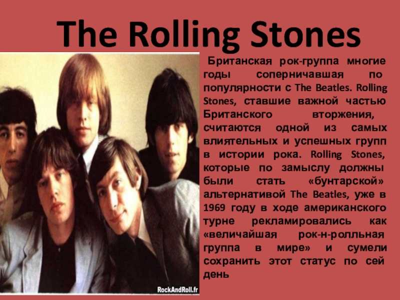 The Beatles. Rolling Stones, ставшие важной частью Британского вторжения, считаются одной из самых влиятельных и успешных групп в истории рока. Rolling Stones, которые по замыслу должны были стать «бунтарской» альтернативой The Beatles, уже в 1969 году в ходе американского турне рекламировались как «величайшая рок-н-ролльная группа в мире» и сумели сохранить этот статус по сей день