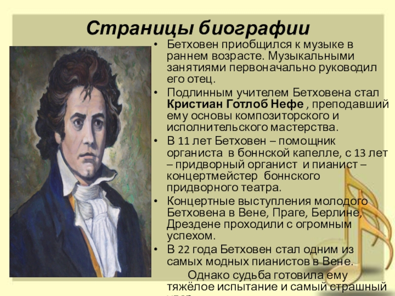 Подлинным учителем Бетховена стал Кристиан Готлоб Нефе , преподавший ему основы композиторского и исполнительского мастерства.