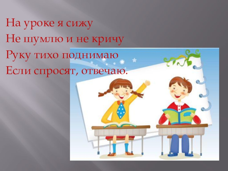 На уроке я сижуНе шумлю и не кричуРуку тихо поднимаюЕсли спросят, отвечаю.