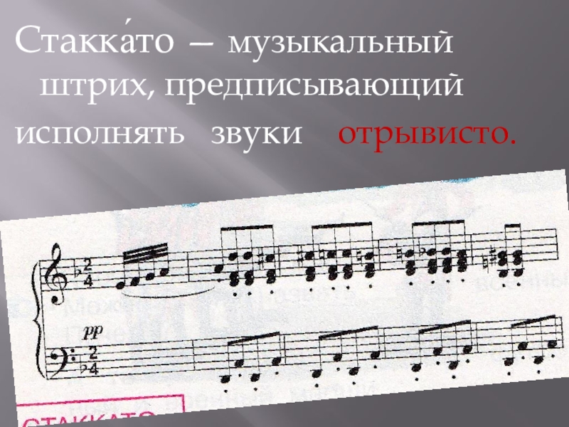 Слайд 8Стакка́то — музыкальный штрих, предписывающий