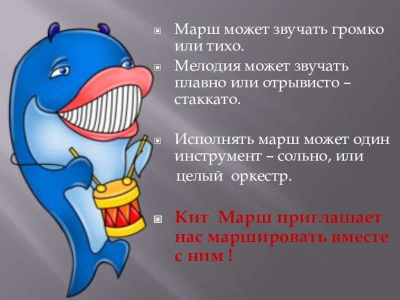 Марш может звучать громко или тихо.Мелодия может звучать плавно или отрывисто – стаккато.Исполнять марш может один инструмент