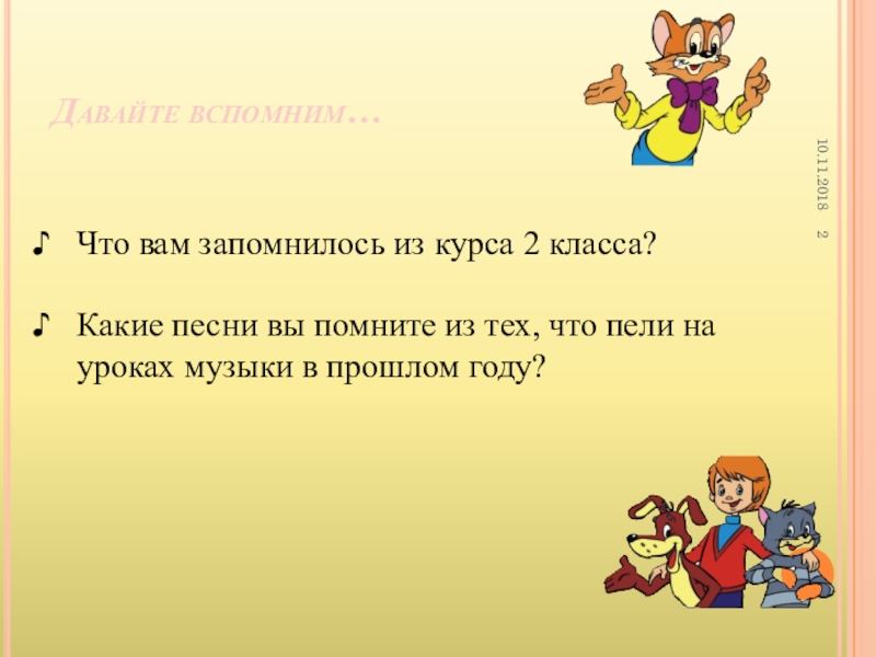 Давайте вспомним…Что вам запомнилось из курса 2 класса?Какие песни вы помните из тех, что пели на уроках