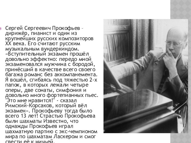 композиторов ХХ века. Его считают русским музыкальным вундеркиндом. «Вступительный экзамен прошёл довольно эффектно: передо мной экзаменовался мужчина с бородой, принёсший в качестве всего своего багажа романс без аккомпанемента. Я вошёл, сгибаясь под тяжестью 2-х папок, в которых лежали четыре оперы, две сонаты, симфония и довольно много фортепианных пьес. "Это мне нравится!" - сказал Римский-Корсаков, который вёл экзамен». Прокофьеву тогда было всего 13 лет! Страстью Прокофьева были шахматы Известно, что однажды Прокофьев играл шахматную партию с экс-чемпионом мира по шахматам Ласкером и смог свести её к ничьей.