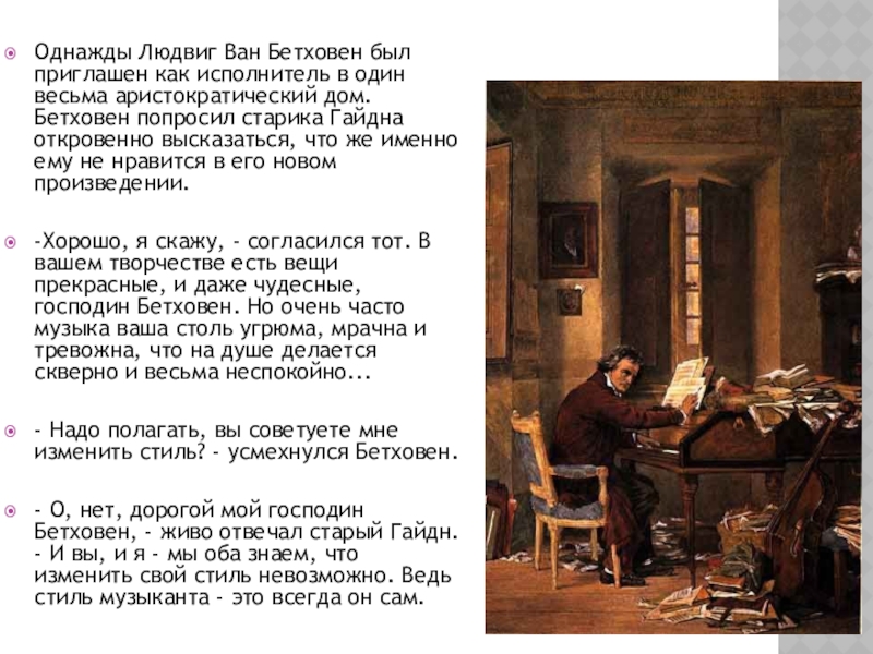 аристократический дом. Бетховен попросил старика Гайдна откровенно высказаться, что же именно ему не нравится в его новом произведении.