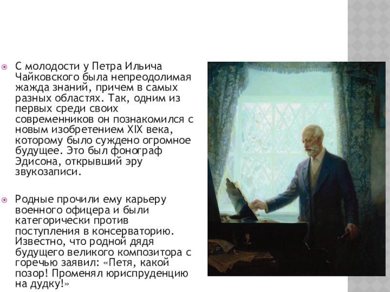 Слайд 9С молодости у Петра Ильича Чайковского была непреодолимая жажда знаний, причем