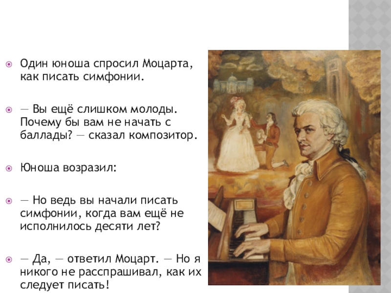 Слайд 6Один юноша спросил Моцарта, как писать симфонии.