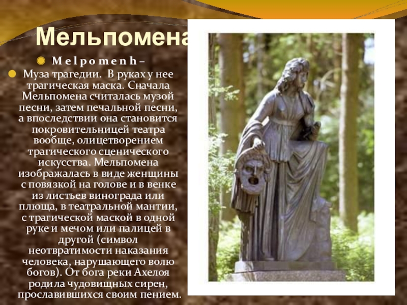 Мельпомена считалась музой песни, затем печальной песни, а впоследствии она становится покровительницей театра вообще, олицетворением трагического сценического искусства. Мельпомена изображалась в виде женщины с повязкой на голове и в венке из листьев винограда или плюща, в театральной мантии, с трагической маской в одной руке и мечом или палицей в другой (символ неотвратимости наказания человека, нарушающего волю богов). От бога реки Ахелоя родила чудовищных сирен, прославившихся своим пением.