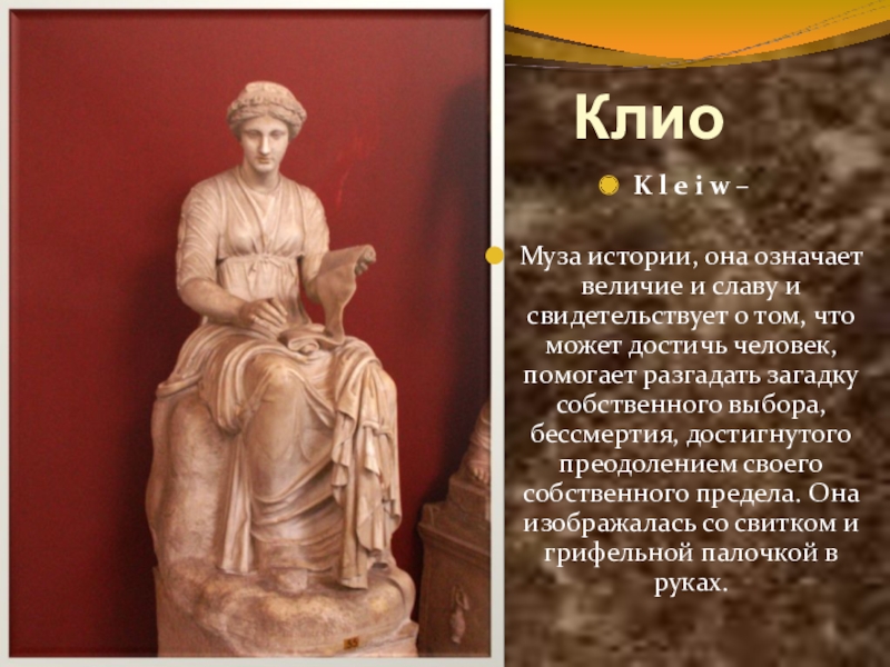 о том, что может достичь человек, помогает разгадать загадку собственного выбора, бессмертия, достигнутого преодолением своего собственного предела. Она изображалась со свитком и грифельной палочкой в руках.