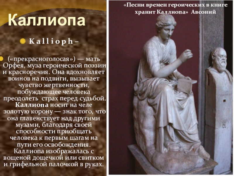 поэзии и красноречия. Она вдохновляет воинов на подвиги, вызывает чувство жертвенности, побуждающее человека преодолеть страх перед судьбой. Каллиопа носит на челе золотую корону — знак того, что она главенствует над другими музами, благодаря своей способности приобщать человека к первым шагам на пути его освобождения. Каллиопа изображалась с вощеной дощечкой или свитком и грифельной палочкой в руках.
