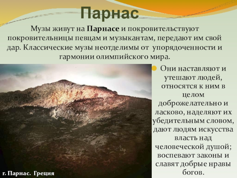 Музы живут на Парнасе и покровительствуют покровительницы певцам и музыкантам, передают им свой дар. Классические музы неотделимы от упорядоченности и гармонии олимпийского мира.