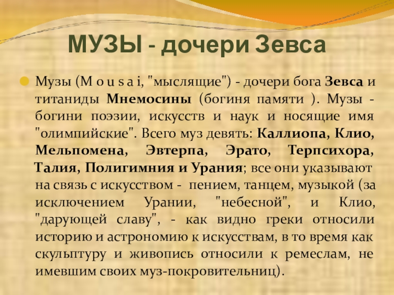 - дочери бога Зевса и титаниды Мнемосины (богиня памяти ). Музы - богини поэзии, искусств и наук и носящие имя "олимпийские". Всего муз девять: Каллиопа, Клио, Мельпомена, Эвтерпа, Эрато, Терпсихора, Талия, Полигимния и Урания; все они указывают на связь с искусством - пением, танцем, музыкой (за исключением Урании, "небесной", и Клио, "дарующей славу", - как видно греки относили историю и астрономию к искусствам, в то время как скульптуру и живопись относили к ремеслам, не имевшим своих муз-покровительниц).
