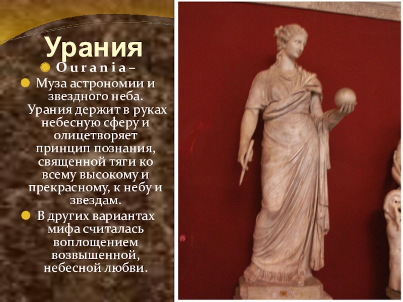 звездного неба. Урания держит в руках небесную сферу и олицетворяет принцип познания, священной тяги ко всему высокому и прекрасному, к небу и звездам.