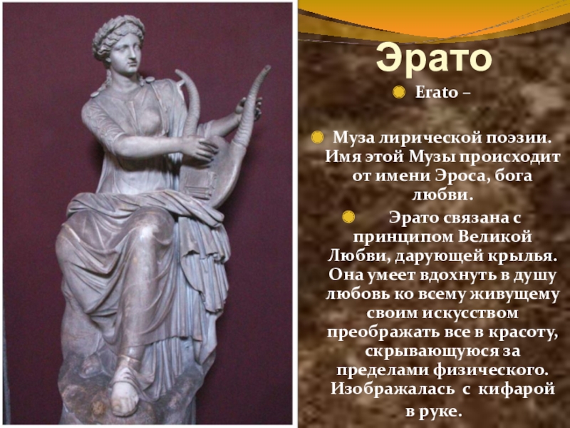 Эрато связана с принципом Великой Любви, дарующей крылья. Она умеет вдохнуть в душу любовь ко всему живущему своим искусством преображать все в красоту, скрывающуюся за пределами физического. Изображалась с кифарой