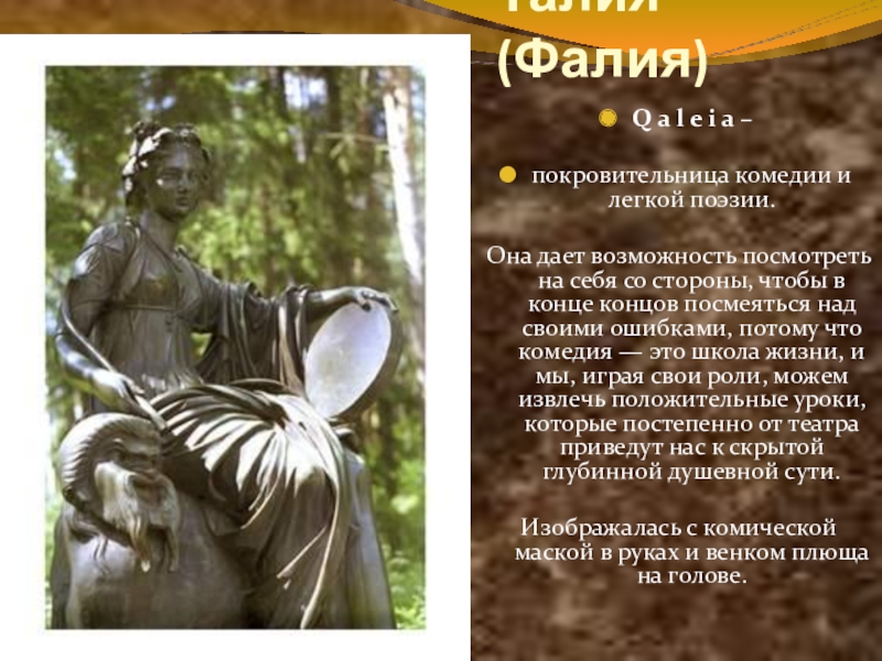 внешним и внутренним, душой и телом , изображалась в виде молодой женщины в позе танцовщицы, с улыбкой на лице. На голове у нее был венок, в одной руке она держала лиру, а в другой плектр. Она - "наслаждающаяся хороводами".