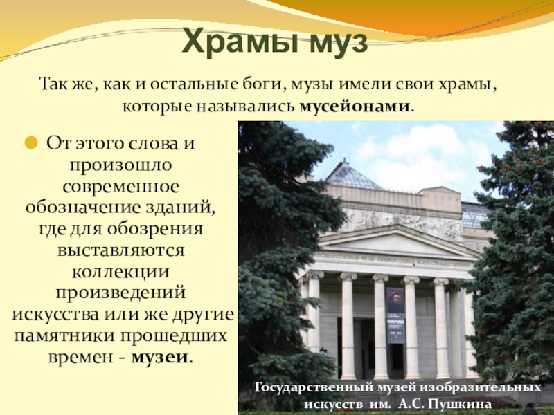 Так же, как и остальные боги, музы имели свои храмы, которые назывались мусейонами.
