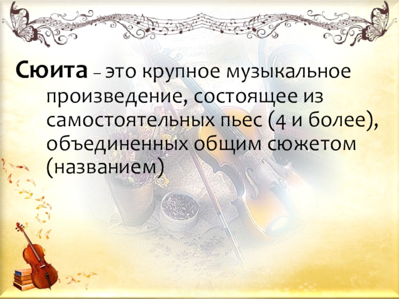 Сюита – это крупное музыкальное   произведение, состоящее из самостоятельных пьес (4 и более), объединенных общим