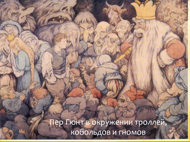 Слайд 14Пер Гюнт в окружении троллей, кобольдов и гномов