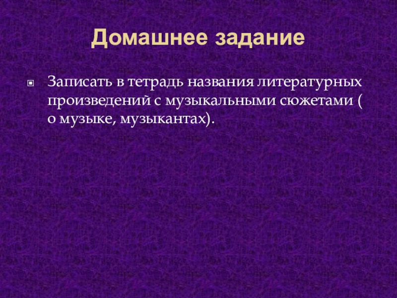 Записать в тетрадь названия литературных произведений с музыкальными сюжетами (
